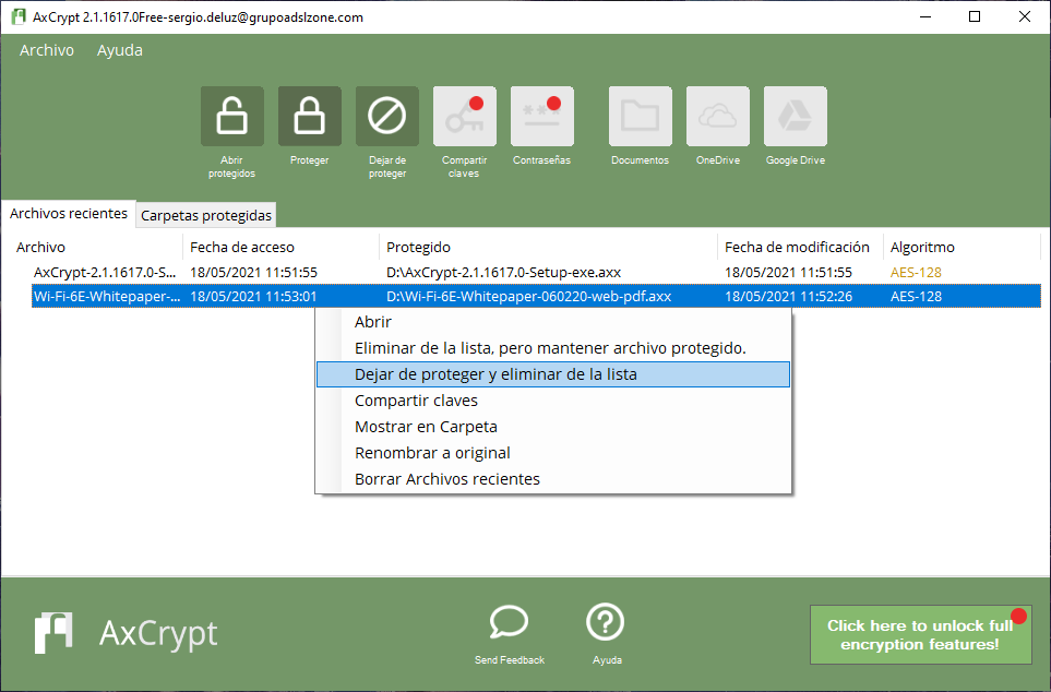When we have encrypted it, it will appear in the list of recent files. If we want to decrypt this file, we will have two options, either click on "Open Protected" or simply double-click on the file from Windows Explorer. If we do the latter, the program will tell us that it is performing the decryption without asking for the password again, because we have logged in with the AxCrypt ID.