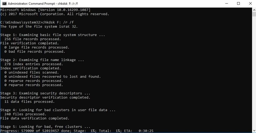 3. Type “chkdsk X: /r /f” where X is the letter of the external hard drive.